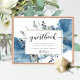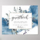 Elegante sinal de livro de visitas com a capacidade de alterar o texto para se adequar a qualquer evento. Exquisita aguarela floral pintada à mão com delicada mancha de aguarela azul por trás. Flores e folhagens em tons de azul empoeirado, azul naval, branco, cinza e verde sage. Uso de detalhes de caligrafia moderna manuscrita e tipografia em bloco. Livro de registro de convidados disponível. Parte da nossa coleção de casamento e eventos "Montanhas Azuis Rústicas".