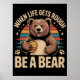 Esta ilustração envolvente apresenta um urso simpático e sorridente segurando um pote de mel ouro. O urso é posicionado contra um arco riscado vibrante e inspirado por retrorreflectores em tons quentes, com estrelas sutis e estampas de pata flanqueando o texto inferior. O texto de cima "QUANDO A VIDA PASSA" é curvo sobre o urso, enquanto "BE A BEAR" é exibido com ousadia abaixo. O design geral transmite uma sensação de resiliência, força e conforto, sugerindo a habilidade de encontrar doce e calma mesmo em tempos desafiadores.