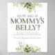 Um jogo divertido para seus convidados adivinharem o tamanho da barriga da mamãe. Um elegante e divertido cartaz de chá de fraldas com tipografia azul empoeirada moderna e bonito folhagem botânica. Projetado por Thisnotme©