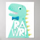 Design fofo para o seu quarto de berço ou decoração do quarto das crianças. Há uma ilustração de um dinossauro verde com espinhos amarelos, gravata azul e um sorriso no rosto. Na barriga dele está escrito "RAWR!" em uma tipografia divertida. Ótimo para bebês meninos e crianças.