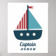 Cartaz fofo para o quarto do seu menino ou berçário. Ilustração de um barco em cores azul e vermelho com um texto personalizado na parte inferior que diz "capitão". Adicione o nome da criança na parte inferior.