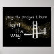 As pontes que queimo acendem o caminho... o caminho para quê? Talvez seja para esclarecer o caminho para aqueles que vêm atrás de mim. Talvez seja para iluminar meu caminho até a próxima ponte. De qualquer forma, uma vez que uma ponte é queimada, não há retorno. Pelo menos, estarei sempre a avançar pronto para a minha próxima aventura e para uma nova fase na vida. Onde quer que você vá, você está fazendo isso com coragem e coragem!