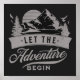 Estilo retrô "Que a aventura comece" design de texto com montanhas, pássaros, rios, pinheiros e a ilustração do pôr do sol retrô para todos que gostam da natureza e da design. É fácil mudar o fundo e personalizá-lo.