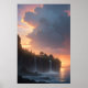 Uma pintura digital mostra uma paisagem serena com um dramático pôr do sol. O céu é dominado por uma grande nuvem fluffy, pintada em tons de rosa, laranja e roxo. Abaixo, um penhasco com cachoeiras em cascata cai num oceano calmo. A água reflete as matizes quentes do pôr do sol, criando uma atmosfera tranquila e etérea.