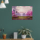Poster com uma imagem cênica de um lago roxo pacífico. Cercados por cerejeiras e cachoeiras.