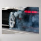 Carro preto a fazer queimaduras, rodinhas que provocam a fumaça dos pneus. Fotografia.