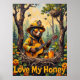 Este trabalho de arte imaginativo apresenta um urso, vestido de bombeiro, com capacete e óculos de sol, sentado num grande ninho de pássaros e tocando um violão acústico. Duas abelhas pairam perto, e um pote de mel se senta no ninho. O fundo é uma floresta verde vibrante, com "Love My Honey" exibido de forma ousada abaixo. As pinceladas grossas e texturizadas da pintura dão uma sensação caprichosa e animadora à cena.