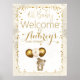 Sinal de boas-vindas do Baby Sprinkle. Corações em chuva de ouro, belos e antigos mapas de fundo, cobertura de luz com borda de ouro escutadora, adorável ursinho d'água e balões com data de festa e nome de convidado de honra.
