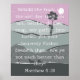 Mateus 6:26 - "Cuidado com as galinhas do ar: porque elas não semeiam, nem colham, nem se juntam em celeiros; no entanto, o seu Pai celestial alimenta-as. Você não é muito melhor do que eles?" Poster de pastel Whimsical de uma garota voando no ar com balões, montanhas, lua, rosa e design de cinza. Arte original projetada por Suzanne Hein Creations.
