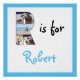Carregue fotos para preencher a letra R e adicione o nome da criança para criar um poster azul especial para o quarto da criança.