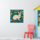Impressão em ilustração de um coelho selvagem, cercado por ramos floridos, sobre fundo azul-denim escuro