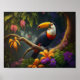 Toucano ilustrado nos ramos de árvores cercados por flores tropicais vibrantes em uma floresta tropical.