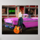 Linda mulher em frente a um restaurante de 50 e um carro descapotável de 1956 segurando sua guitarra Rockabilly
