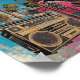 Arte de rua contemporânea celebrando a cultura do salto-do-quadril de Los Angeles com silhueta-quebradiana contra o horizonte da cidade. Possui texto 'HIP HOP' proeminente, gráficos de caixa de cores, palmeiras e prédios de LA centro silenciados contra um grande sol amarelo. Combina a estética do grafite com imagens da cultura urbana retrorada dos anos 80 e 90 em uma paleta de cores rosa, azul e amarela em negrito.