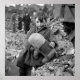 Foto antiga WW2 de garoto abandonado segurando um brinquedo de animais recheado em meio a ruínas após bombardeio aéreo alemão em Londres. Foto tirada em 1945 pelo fotógrafo Toni Frissell.