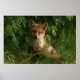 Poster com uma fotografia com uma raposa de bebê fox bonitinha com pelo vermelho e branco. Cercados por folhas e gramíneas verdes e peludas.