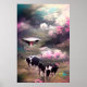 Holsteins brancos e negros incautos a pastorear num campo enquanto uma nave espacial paira à distância. Outro rapto típico de vacas na velha fazenda MacDonald. Wombo Dream AI e colaboração de artistas.