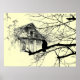 Uma silhueta do pássaro e ramos nus. Pode ser corvo, corvo ou torre. Casa de madeira russa vitoriana abandonada. Você pode alterar a cor do fundo se pressionar o botão "personalizar".