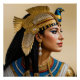 "Realismo de Cleópatra VII: Um Retrato". Uma renderização semelhante à vida de Cleópatra VII mostra-a com um nariz proeminente, olhos em forma de amêndoa e um queixo forte. Seu cabelo, trançado e adorado com ouro de penas, complementa o seu diadema de ouro real em forma de urubu, que simbolizava pureza e maternidade, e também o eterno ciclo de morte e renascimento. Os brincos de pérola e um colar intricado reforçam a presença da rainha com um olhar inteligente que reflete o seu legendário carisma e sabedoria.