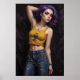 An edgy portrait of a bold young woman with purple hair and chain-embellished jeans, celebrating rebellion, style, and individuality.