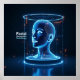 Uma exibição holográfica futurística em 3D projeta um rosto humano com código e circuito intrincados, simbolizando o reconhecimento facial com recursos de IA. Colocado sobre um fundo azul escuro iluminado por neon, sotaques brilhantes realçam a precisão e a análise em tempo real da tecnologia, enquadrada por uma elegante borda prateada com tipografia ousada.