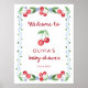 Este adorável sinal de boas-vindas do chá de fraldas apresenta um design branco, estilo avenês, de cereja vermelha, com uma cor azul-d-água e flores, e pontos verdes bonitos. O guião elegante vermelho de vintage adiciona estilo a este design chic e na moda que é neutro em termos de gênero e perfeito para um bebê ou uma menina.