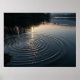 Esta imagem pacífica e evocativa captura um belo momento de um lago tranquilo ao anoitecer. Os últimos raios de ouro do sol criam um percurso de luz brilhante através da água, que é interrompido por uma série de ondulações concêntricas. As ondulações, talvez provocadas por uma pedra caída ou por um suave salto, distorcem lindamente o reflexo, transformando a luz numa espiral cativante. À distância, as silhuetas de árvores e um casal de patos somam à atmosfera serena e tranquila.