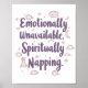Embrace your need for "me time" with this funny and relatable graphic. Featuring the sassy quote "Emotionally Unavailable, Spiritually Napping" in a whimsical purple font, this design is surrounded by cute, sleepy clouds and stars. It's the perfect statement for introverts, or for anyone who is feeling drained and is officially checking out for a spiritual nap.