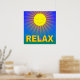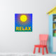 Um poster grande e colorido com um grande sol sorridente e sob ele a palavra "relaxe". Projetado para trazer tranquilidade e sensação de calor.