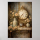 Um relógio antigo rodeado por rosas suaves e elementos decorativos vintage em tons neutros quentes. A composição cria uma atmosfera romântica shabby chic com detalhes florais atemporais.