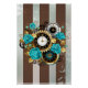 Relógio antigo e patenteado, adornado com joias, mãos de ouro e algarismos latinos com rosa de turquesa sobre fundo castanho e listrado. Estilo Steampunk.