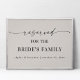 Sinal de Casamento Reservado para a Família da Noiva em Marfim - Off-White - em belo script de caligrafia e com o seu texto personalizado. Um design elegante e simples em qualquer cor de fundo que você escolher. Basta clicar no link "editar usando a ferramenta de design", mostrado abaixo da área de personalização do texto à direita, e escolher a cor de fundo personalizada. Este modelo de cartaz de sinalização torna rápido e fácil criar adições impressionantes para a decoração do seu casamento. Os sinais podem ser ampliados, há muitos tamanhos para escolher, bem como opções de moldura e passe-partout personalizados.
