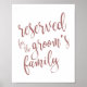 Um elegante cartaz de noiva, que apresenta o texto "reservado para a família do noivo" em uma letra extrovertida, a textura brilhante acrescenta um toque festivo e glamouroso. A cor de fundo pode ser personalizada de acordo com as suas necessidades e preferências, contacte-me se tiver alguma solicitação especial.