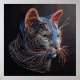 Um retrato artístico com a cabeça de um gato feito com linhagens brancas e coloridas. Colocado sobre um fundo escuro, esse desenho abstrato traz o charme felino à vida em uma composição caprichosa e imaginativa.