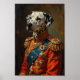 Um ousado retrato real apresentando o dálmata retratado como um nobre comandante de brigada de incêndio. Inspirado em pinturas a óleo clássicas, o design destaca a icônica pelagem manchada da raça e a herança histórica dos estábulos de bombeiros com detalhes de uniforme cerimonial e estilo régio.