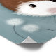 Uma pintura digital de um caprichoso coelho branco e marrom peludo é vista contra o fundo azul com textura de madeira. Algumas ervas daninhas de dente-de-leão brancas e fofas são vistas de ambos os lados do coelho. Bela pintura em cores suaves é perfeita para qualquer área temática da floresta, seja um berçário, uma creche ou uma sala de brinquedos. Design original de Christie Black da Creations from the Heart.