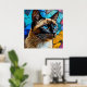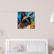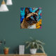 Uma representação artística cativante de um gato siamês, apresentando olhos azuis impressionantes contra um fundo abstrato dinâmico e colorido. Perfeito para temas de animais de estimação, criatividade e expressão artística.