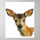 Uma ilustração encantadora e detalhada de um veado bebê com olhos suaves e expressivos e pele delicada, capturando a inocência e beleza da natureza.