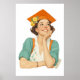 Uma jovem alegre beija com orgulho nesta ilustração de graduação em estilo vintage, completa com um boné laranja adornada com flores amarelas, evocando um espírito nostálgico e otimista.