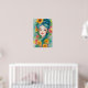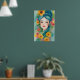Este design vibrante e caprichoso apresenta um retrato abstrato de uma mulher com cabelo azul lacrimejado com flores coloridas. Sua expressão serena é acentuada por olhos fechados e lábios vermelhos, dando a ela uma aparência de sonho. Ao redor dela estão girassóis vibrantes, flores cor-de-rosa, e uma variedade de folhagem verde, criando uma atmosfera exuberante, semelhante a jardim. A peça tem um estilo de interface suave e vetorial, dando-lhe um sentimento moderno, mas romântico. A paleta de cores é dominada por chaleiras, amarelos, pinças e verdes, criando uma composição harmoniosa e atraente para os olhos.