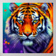 Representação vibrante e marcante de um tigre, caracterizada por sua pele ricamente colorida, predominantemente laranja com riscas pretas em negrito. O rosto do tigre é frente e centro, mostrando seus intensos olhos amarelo-esverdeados que desenhar o espectador. O fundo consiste num gradiente colorido, misturando tons de turquesa e roxo, juntamente com abstrato de cores que melhoram o impacto visual geral. A textura detalhada do pelo e as características expressivas do tigre contribuem para uma representação dinâmica e envolvente desse animal majestoso.