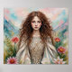 Retrato fantástico etéreo de uma mulher de cabelos cacheados em um vestido ornamentado, cercada por flores silvestres e paisagens montanhosas nebulosas - arte romântica e pictórica.