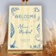 Seaside on the beach fun striped citrus yellow and blue playful unique wedding welcome sign printable poster featuring hand drawn starfish and ocean corals, and a chic whimsical handwritten calligraphy script. +++++++ All colors are editable. +++++++++ Suitable for retro casual trendy beach coastal summer destination weddings.
