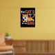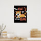 Este gráfico brincalhão apresenta um feliz gato de desenho animado listrado, laranja e branco, representado em uma pose viva e espalhada com sua língua para fora. O texto branco e laranja em negrito declara, com humor, "O GATO ESTÁ FORA DO SACO", com um pequeno ícone de arco sugerindo uma gravata de saco. Impressões coloridas de pata e sotaques brilhantes adicionam ao encanto vibrante, todos colocados contra um fundo preto sólido. Download digital apenas para uso pessoal.