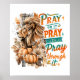 Design cor e pacífica apresentando uma cena de outono/outono com a majestosa cabeça de leão, abóboras e flores de outono. O texto colorido inspiracional diz: "Rezem nele, rezem por cima dele, rezem através dele". Esse design está disponível em uma grande variedade de produtos.