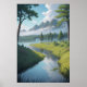 A imagem retrata uma paisagem tranquila com um rio enrolamento fluindo através de um campo verde e exuberante. O rio reflete o céu azul claro e nuvens brancas lisas acima. À distância, montanhas majestosas subem, seus picos parcialmente obscurecidos por uma névoa macia. A cena é banhada à luz do sol quente, lançando longas sombras sobre o campo.