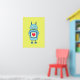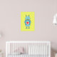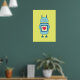 Poster com um desenho animado de um robô cartoon azul desajeitado segurando uma placa com um coração sobre fundo amarelo-esverdeado brilhante. Este poster de robô é adequado para crianças que amam robôs. Também vai fazer um presente excelente para geeks.