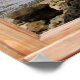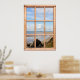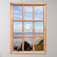 O gentil oceano nesta cena de janela calmante se curva para encontrar uma praia de areia macia ouro. No primeiro plano estão rochas e capim, e o céu acima é azul, com cúmulo branco e nuvens de estratos. Esta é uma visão do mar muito pacífica, enquadrada por uma janela em uma madeira quente, que cria uma visão falsa convincente em qualquer parede em sua casa.