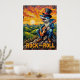 Esta pintura branca retrata um tubarão, adornada com um chapéu de cima e óculos de sol vermelhos, tocando apaixonadamente uma guitarra elétrica sobre uma perca rochosa. Abaixo, rolando colinas verdes pontilhadas com árvores esticadas em direção a um brilhante céu por sol. A ousada e texturizada técnica traz uma qualidade viva, tridimensional à paisagem e ao personagem, incorporando perfeitamente o espírito "ROCK and ROLL".