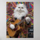 Um gato persa branco está vestido com garbe psíquica e está tocando um violão acústico.